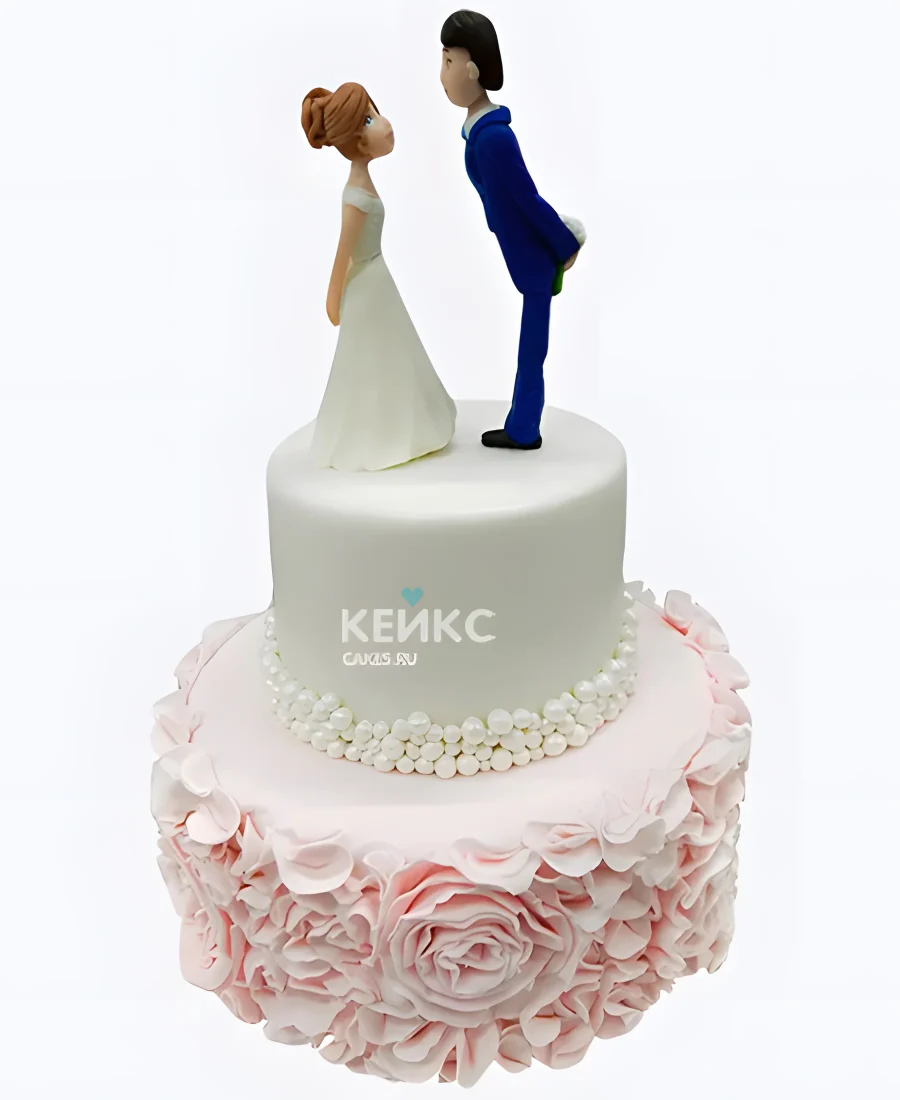 Свадебный торт с женихом и невестой с рюшами из роз