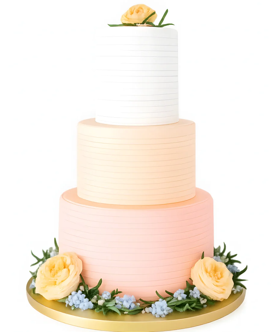 Разноцветный трехъярусный свадебный торт с живыми цветами