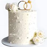 Свадебный торт с золотыми кольцами белыми розами и жемчугом