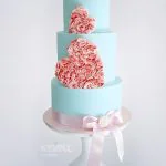 Трехъярусный голубой свадебный торт с сердцами и бантом