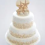 Этот трехъярусный свадебный торт словно соткан из морского бриза и солнечных бликов. Ослепительно белая мастика переливается мягкими складками, напоминающими пену волн, а золотые бусины рассыпаны по поверхности, как драгоценные капли на песке. Каждый ярус плавно перетекает в следующий, создавая ощущение легкости и воздушности. Торт выглядит одновременно роскошно и нежно, будто вобрав в себя всю элегантность морской стихии.