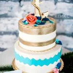 Изысканный двухъярусный торт в морской тематике. Нежная бирюзовая мастика напоминает морские волны, а золотые акценты создают эффект солнечных бликов на воде. Элегантные ракушки и жемчужные бусины добавляют торту утонченности и романтики. Сдержанная цветовая гамма и плавные линии дарят ощущение гармонии и спокойствия морского бриза.