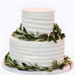Нежный свадебный торт в стиле французского Прованса. Два круглых яруса покрыты мягким кремом с тонкими вертикальными полосками. Основной белый цвет гармонично сочетается с пастельными оттенками розового и лавандового. Украшен живыми веточками лаванды и мелкими цветами, которые создают романтичное и воздушное настроение. Лёгкая небрежность в оформлении добавляет шарма и тепла, напоминая о солнечных полях южной Франции.