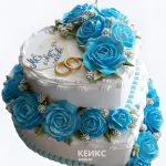 Свадебный торт в виде сердца с голубыми розами и кольцами