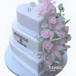 Свадебный торт в виде сердца с розами из мастики и надписью