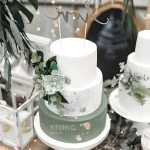 Этот трехъярусный свадебный торт словно соткан из нежных оттенков весеннего сада. Основной белоснежный фон гармонично сочетается с пастельно-зелеными акцентами, создавая ощущение свежести и легкости. Золотые элементы добавляют торту благородный блеск, а изящный зеленый цветок венчает композицию, придавая ей завершенность. Плавные линии и деликатная текстура поверхности напоминают шелковистые лепестки, а общая цветовая гамма вызывает ассоциации с пробуждающейся природой.