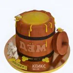 Перед нами удивительно реалистичная съедобная скульптура в виде деревянной бочки. Состаренные доски с текстурой древесины, металлические обручи и даже капли янтарного мёда, стекающие по бочке — каждая деталь проработана с невероятной точностью. Тёплая цветовая гамма оттенков дерева и золотистого мёда создаёт уютную атмосферу лесной пасеки. Этот торт словно переносит в сказочный мир, где каждая деталь рассказывает свою историю.