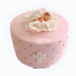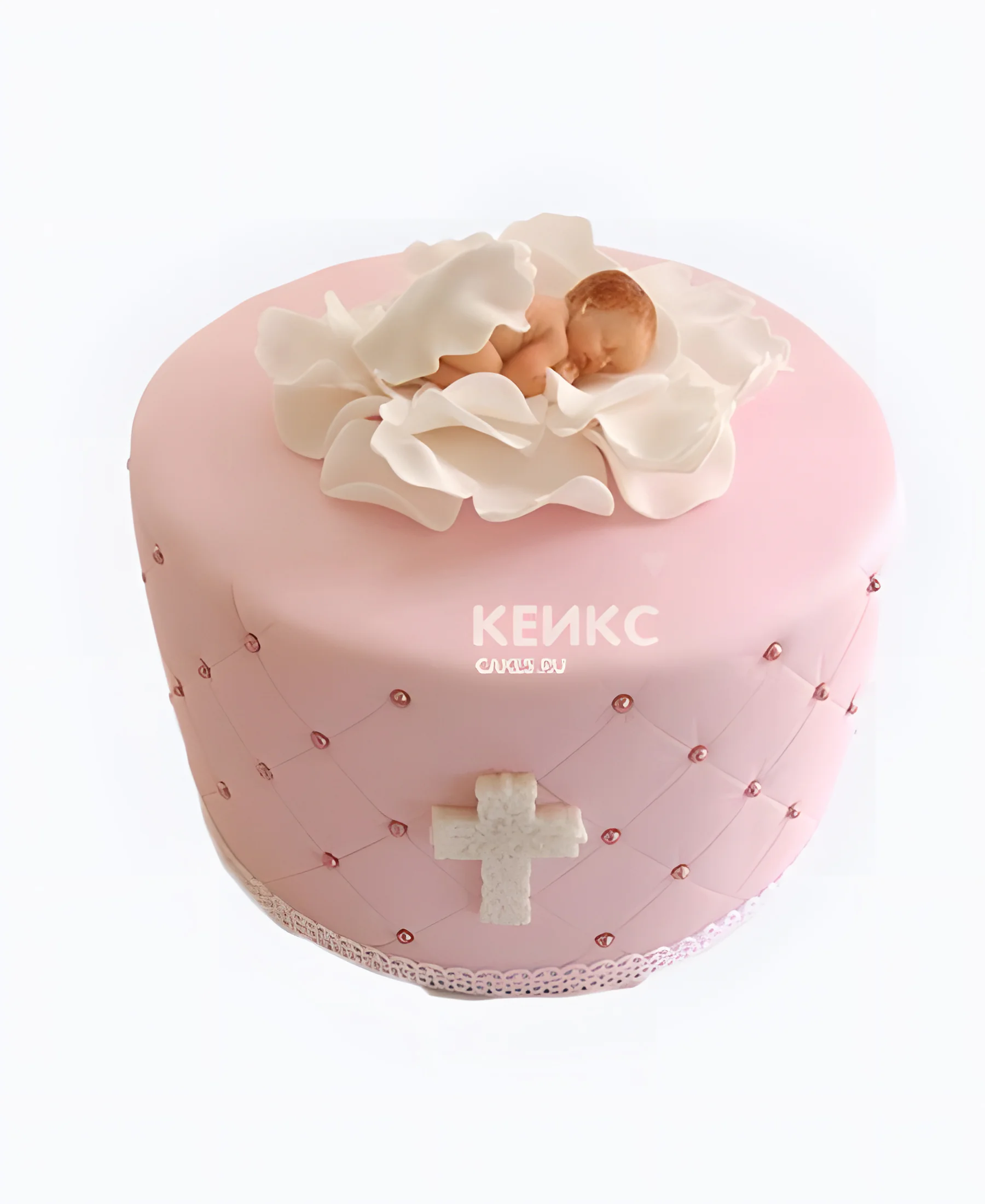 Нежный розовый торт с воздушными волнами мастики, будто окутанный морской пеной. В центре композиции – миниатюрный ангелочек, уютно устроившийся в перламутровой ракушке. Пастельные оттенки розового, кремового и золотистого создают ощущение сказочного подводного царства. Тонкие жемчужные бусины и изящные завитки добавляют торту лёгкость и изысканность. Кажется, будто этот десерт сошёл со страниц волшебной книги.