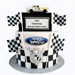 Двухъярусный круглый торт в строгой черно-белой гамме. Верхний ярус украшен изящными гоночными флажками, создающими динамичный акцент. Матовое покрытие из мастики придает торту современный лаконичный вид. Сочетание графичных линий и минималистичного декора напоминает о мире автоспорта, вызывая ощущение скорости и стиля.