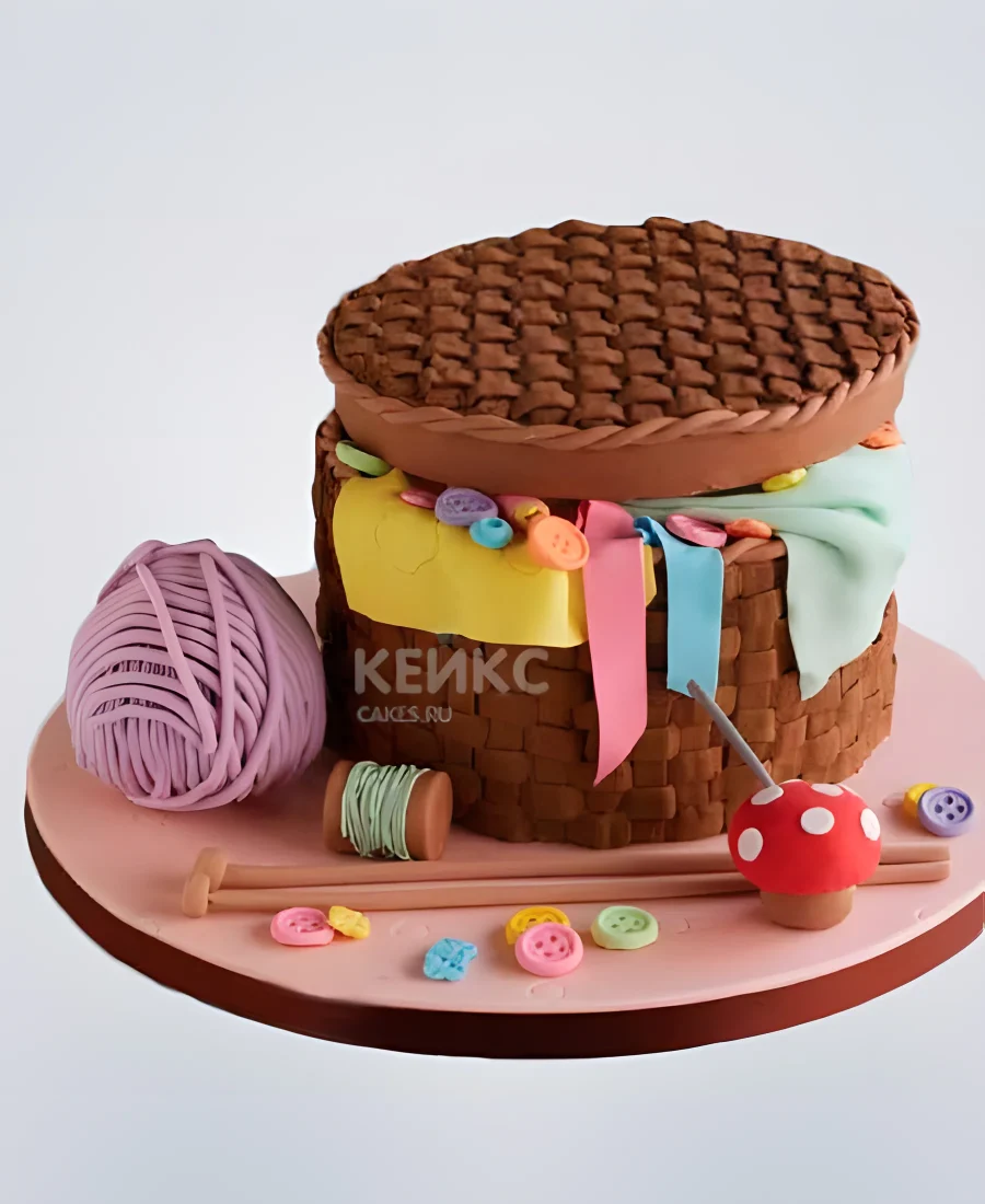 Торт в виде круглого ящика со швейными принадлежностями