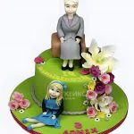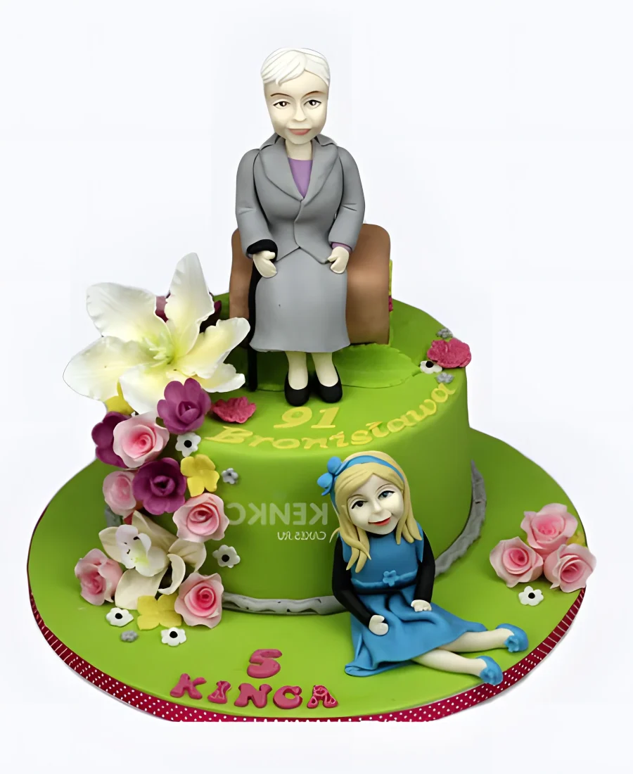 Зеленый торт с цветами с фигурками бабушки и мамы