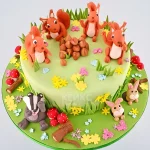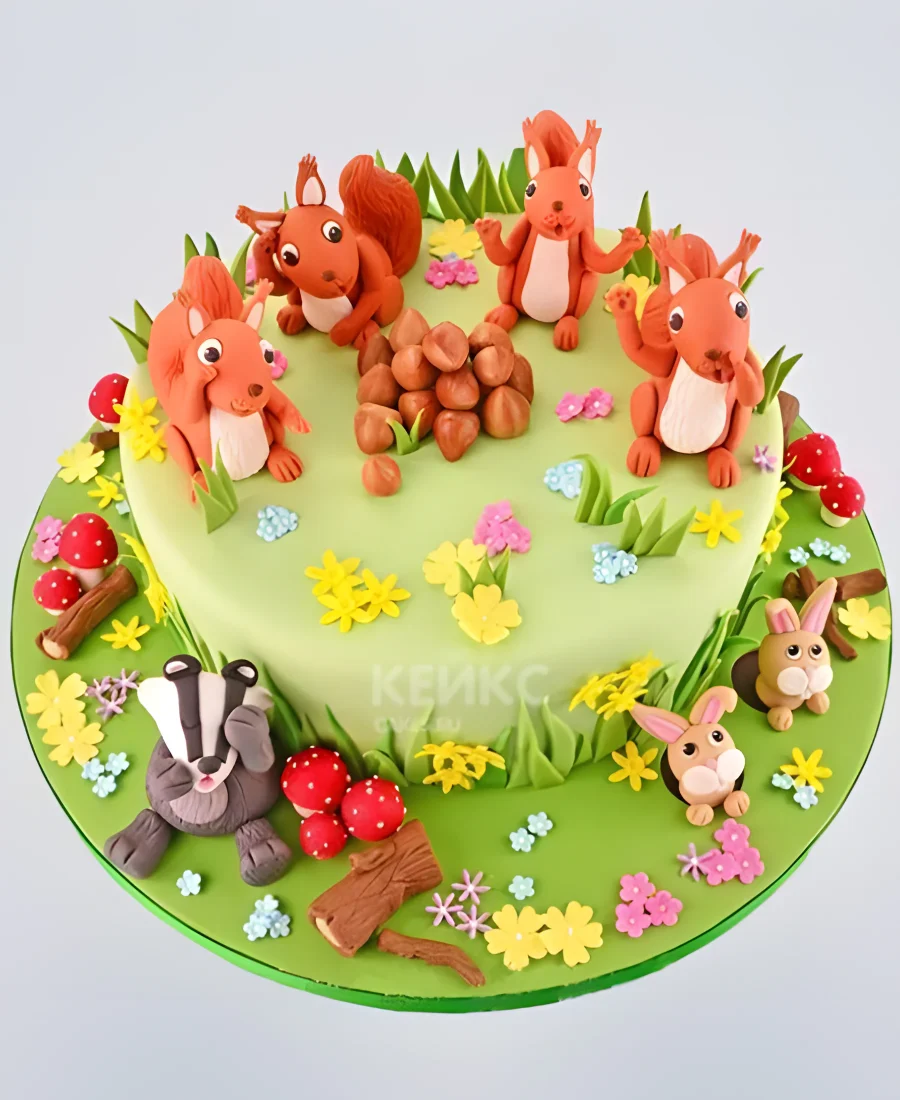 Яркий торт с белочками и орехами на полянке