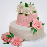Нежный двухъярусный торт в пастельной гамме словно окутан воздушной дымкой. Розовые и белые оттенки мягко перетекают друг в друга, создавая ощущение легкости. Верхний ярус украшен изящными сахарными цветами с тонкими лепестками, которые будто только что расцвели. Нижний ярус дополнен деликатными рюшами из мастики, добавляющими торту объем и праздничность. Сдержанная элегантность и романтичное настроение делают этот торт прекрасным украшением любого торжества.