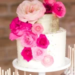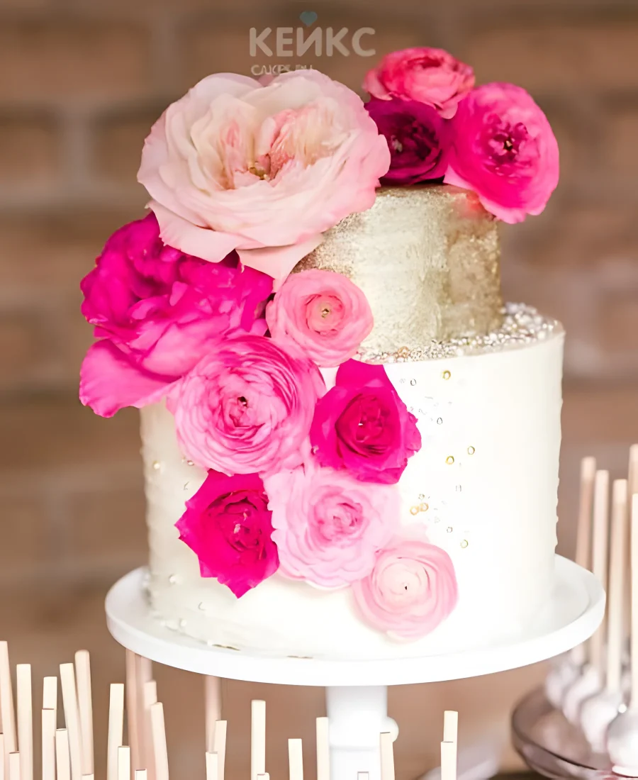 Белый торт с розовыми цветами и золотом