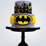 Потрясающий двухъярусный торт в стиле Бэтмена, выполненный из мастики. Основной акцент — детально проработанный логотип легендарного героя на верхнем ярусе. Нижний ярус украшен стильными черными аппликациями, создающими эффект ночного города. Фигурки и элементы декора придают торту динамику и завершенность. Идеальный выбор для тематического праздника!