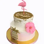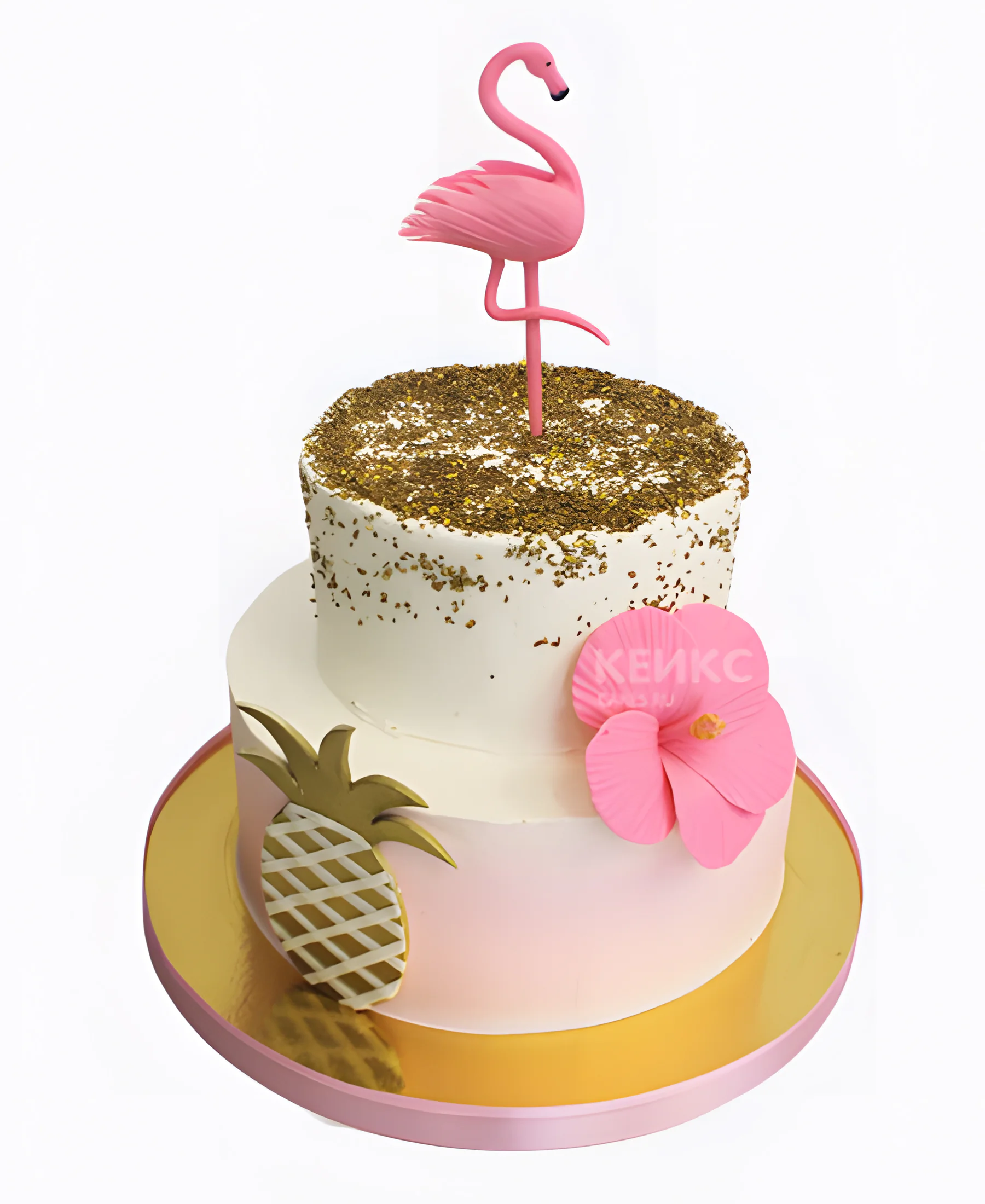 Этот двухъярусный торт — настоящий праздник тропического лета. Его покрывает нежно-розовая мастика, создающая бархатистую основу. В центре композиции — изящный фламинго с золотыми акцентами, а рядом сверкает позолоченный ананас. Сочетание пастельных оттенков и мерцающего золота дарит ощущение тепла, радости и беззаботного волшебства.