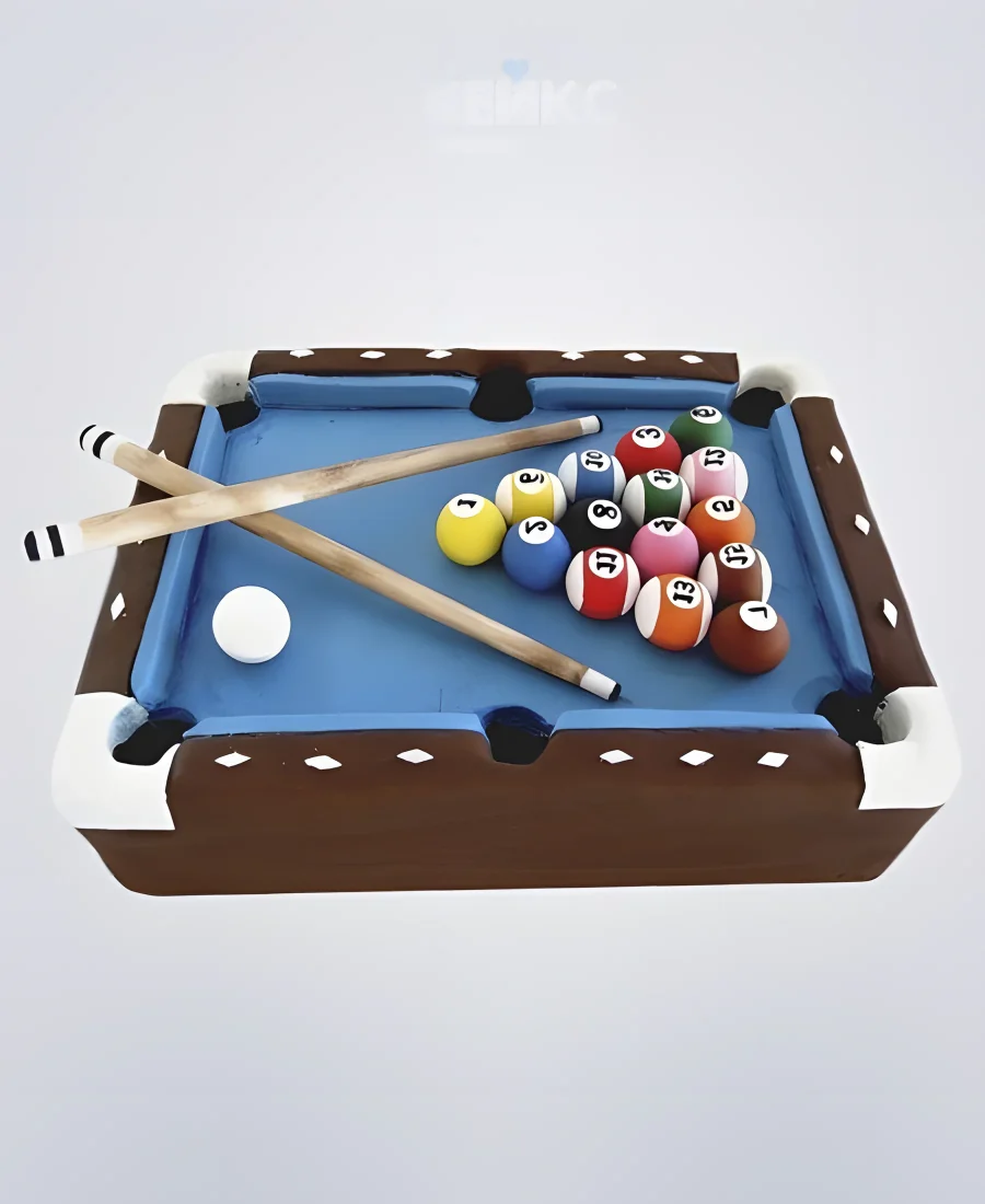 Торт в виде бильярдного стола с киями и шарами