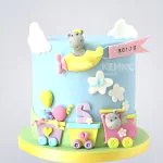 Нежный бирюзовый фон торта напоминает ясное небо, по которому плывут пушистые белоснежные облака. Весёлые мультяшные персонажи с добрыми улыбками создают атмосферу радости и сказки. Гармоничное сочетание голубых и белых оттенков вызывает ощущение лёгкости и беззаботного детского праздника.