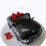 Черный автомобиль BMW в миниатюре — настоящая скульптура из мастики. Каждая деталь проработана с ювелирной точностью: фары, решетка радиатора, колесные диски. Серебристые акценты на черном фоне создают эффект настоящего металлического блеска. Торт станет ярким центром праздничного стола, передавая дух скорости и стиля.