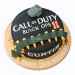 На темном фоне торта эффектно выделяются яркие элементы военной тематики. Контрастные красные и белые детали создают динамичную композицию, напоминающую боевую графику. Строгие геометрические формы и лаконичные символы передают атмосферу компьютерной игры. Торт выглядит как арт-объект, созданный для настоящих геймеров.
