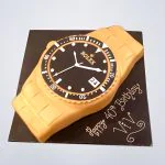 Этот торт в виде старинных часов выглядит как произведение искусства. Объемные золотистые стрелки и римские цифры на темно-синем фоне создают атмосферу таинственности и роскоши. Тонкая проработка деталей – от рельефного циферблата до изящных декоративных элементов – завораживает. Контраст глубокого синего и теплого золота придает торту благородный и немного винтажный вид. Такой торт станет центром внимания на любом празднике, превратив обычный десерт в эффектный арт-объект.