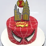 Этот яркий круглый торт украшен красной мастикой с изображением Человека-паука. Надпись на торте делает его персонализированным и идеальным для тематического праздника. Одноярусный дизайн выглядит стильно и лаконично.