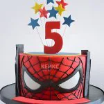 Этот яркий круглый торт оформлен в виде маски Человека-паука. Основной цвет – насыщенный красный, с черными контурами и белыми элементами, имитирующими паутину. Дополнительные детали включают цифру и золотистые звезды, создающие праздничное настроение. Торт покрыт гладкой мастикой, что придает ему аккуратный и эффектный вид. Идеальный вариант для тематического праздника или дня рождения поклонника супергероя.