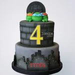 Двухъярусный темно-серый торт Черепашки ниндзя цифрой