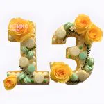 Яркий и нежный торт в виде цифры 13 украшен пышными желтыми розами и сочными ягодами. Открытые коржи придают торту воздушность и современный вид. Желтые цветы создают солнечное настроение, а красные ягоды добавляют контраста и свежести. Такой торт станет центром внимания на любом празднике, особенно в день рождения.