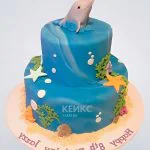 Волшебный морской мир оживает на этом двухъярусном торте. Нежный дельфин с умными глазками словно выпрыгивает из бирюзовой глади океана. Вокруг него танцуют разноцветные морские звезды, а коралловые рифы создают сказочный подводный пейзаж. Переливы синих и голубых оттенков создают ощущение глубины и движения. Каждая деталь продумана до мелочей, перенося в атмосферу морского приключения.