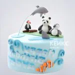 Этот очаровательный круглый торт украшен ярко-голубой мастикой, создающей эффект морской глади. Главными элементами декора стали фигурки дельфина и милых зверушек, которые придают торту игривый и сказочный вид. Одноярусная конструкция делает его идеальным вариантом для детского праздника или тематического мероприятия.