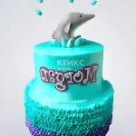 Двухъярусный круглый торт, полностью покрытый голубой мастикой, создает впечатление морской глубины. В центре композиции — веселый дельфин, выпрыгивающий из бирюзовой волны. По бокам рассыпаны кораллы и морские звезды нежных пастельных оттенков. Воздушные белые облака и чайки завершают эту солнечную морскую историю, наполненную радостью и движением.