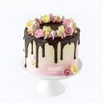 Нежный круглый торт в пастельных тонах с изящными кремовыми розами. Шоколадная глазурь создает элегантный контраст с воздушными цветочными композициями. Розовые и белые оттенки переплетаются в романтичном танце, напоминая о первом бале или сказочном саде. Каждый лепесток будто трепещет от легкого ветерка, добавляя торту особую воздушность и праздничное настроение.