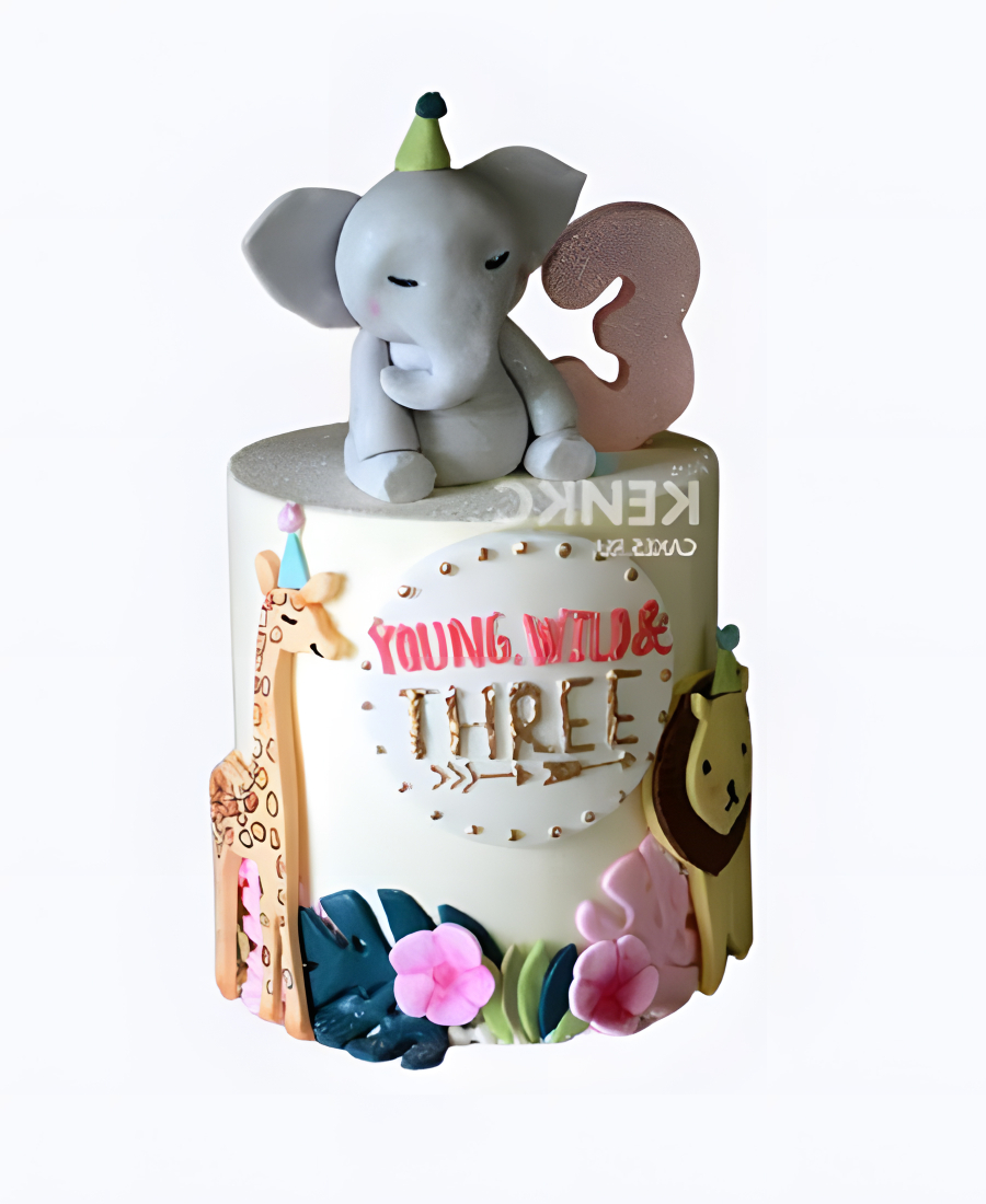Нежный торт в пастельных тонах создает атмосферу сказочного праздника. Основной акцент — милый объемный слоненок в шапочке, который словно сошел со страниц детской книжки. Фон украшен изящными цветами и золотистыми блестками, добавляющими торжественности. Легкие пастельные оттенки розового, сиреневого и мятного гармонично сочетаются, создавая ощущение волшебства и радости. Композиция выглядит цельной и продуманной, притягивая взгляд своей трогательной и праздничной эстетикой.