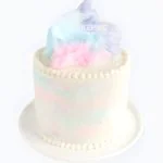 Нежный розовый торт с воздушными облаками сахарной пудры создает ощущение сказки. По бокам — легкие вертикальные полосы крема, напоминающие складки пышного платья. Верх украшен золотистыми цифрой «5» и короной, которые переливаются на фоне пастельного фона. Розовые и белые оттенки сочетаются с золотыми акцентами, придавая торту праздничный и волшебный вид.
