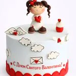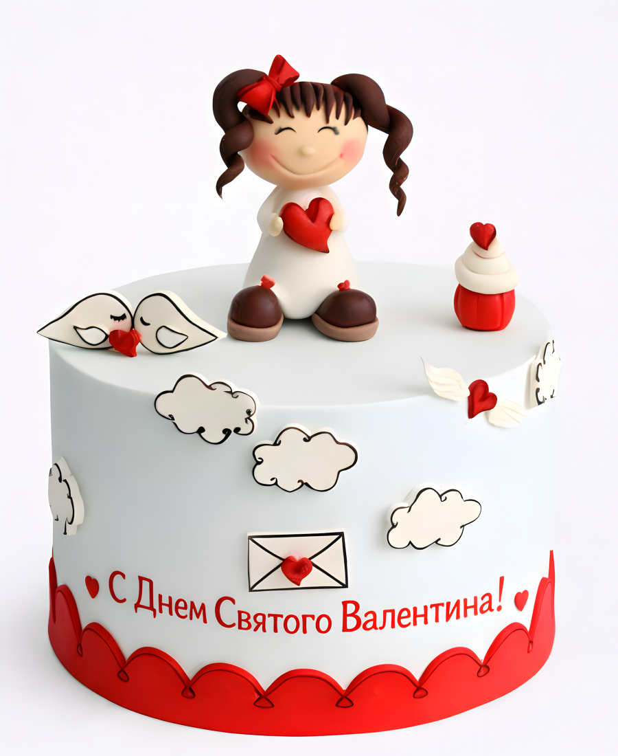 Нежный розовый торт с воздушной композицией из белоснежных облаков. В центре — стилизованная фигурка девушки, окруженная парящими сердечками. Сочетание пастельных оттенков создает легкую романтичную атмосферу. Гладкая мастика и аккуратные детали добавляют торту особой изысканности. Композиция напоминает сладкую сказку или прекрасный сон.