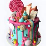 Розовый разноцветный торт со сладостями
