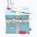 Нежный голубой торт в виде элегантной подарочной коробки с белым бантом создает атмосферу настоящего праздника. Иллюзия перевязанной лентой упаковки выглядит удивительно реалистично. Серебристая надпись «16» добавляет торжественности, подчеркивая значимость события. Лаконичный дизайн в пастельных тонах вызывает чувство изысканности и радости.