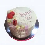 Нежный розовый торт с воздушными кремовыми подтеками создает ощущение праздничной легкости. Золотистые блестки и изящные макаруны добавляют торжественности композиции. Минималистичный декор из съедобных цветов и надпись подчеркивают элегантность дизайна. Сдержанная цветовая гамма передает романтичное настроение, идеально соответствующее юбилею.