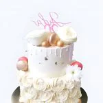 Этот двухъярусный торт — настоящая симфония нежности! Нижний ярус украшен воздушными рюшами, которые создают эффект лёгкой ткани. Верхний ярус венчают изящные цветы пастельных оттенков, будто собранные в весеннем саду. Мягкие кремовые тона и плавные линии придают торту особую женственность и романтичность. Каждый элемент декора продуман до мелочей, создавая гармоничный и элегантный образ. Такой торт станет прекрасным украшением праздника, передавая атмосферу юности и красоты.