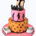 Элегантный двухъярусный торт в нежных розовых тонах. Верхний ярус украшен изящными туфельками, нижний — стилизованными автомобилями. Белоснежные акценты и золотистые детали создают праздничное настроение. Композиция гармонично сочетает женственность и современные мотивы, передавая атмосферу особого торжества.