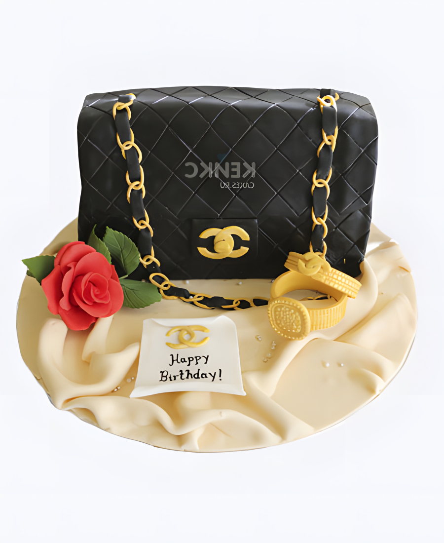 Этот изысканный 3D-торт в виде культовой сумки Chanel поражает точностью исполнения. Глубокий черный цвет мастики создает эффект роскошной кожи, а золотистые детали — цепочка, замок и логотип — добавляют шика. Нежная розовая роза на ручке привносит ноту романтики и женственности. Композиция выглядит как настоящий аксессуар от кутюр, вызывая восхищение мастерством кондитера.