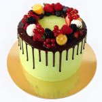 Желтый торт с шоколадной глазурью и яркими фруктами