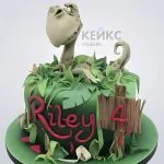 Этот круглый торт украшен яркой мастикой в виде зеленой травы, на которой расположилась фигурка динозавра. Красная надпись на торте добавляет праздничный акцент. Одноярусный дизайн делает его идеальным для детского праздника или тематического мероприятия. Фигурки и детали создают игривую атмосферу, а гладкое покрытие мастикой придает торту аккуратный и завершенный вид.