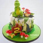 Яркий детский торт с фигуркой зеленого динозавра в центре композиции. Одноярусный десерт покрыт гладкой белой мастикой с цветными акцентами. Фигурка динозавра выполнена из мастики в мультяшном стиле, с крупными глазами и доброжелательным выражением. Торт украшен контрастными зелеными и голубыми элементами, создающими игривое настроение. Идеально подходит для тематического дня рождения.