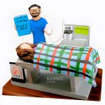 Этот торт — настоящая скульптура из мастики, выполненная в виде шприца с реалистичными деталями. Мягкие синие и белые оттенки создают ощущение стерильности и профессионализма. Торт с юмором обыгрывает медицинскую тематику — шприц выглядит почти как настоящий, с прорисованной шкалой и поршнем. Лаконичная форма и точность исполнения делают его запоминающимся.