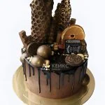 Мощный тёмно-синий фон торта создаёт контраст с золотыми акцентами. Позолоченные шоколадные плитки и декоративные элементы расположены асимметрично, придавая композиции динамику. Чёрные шоколадные капли и золотистые брызги добавляют графичности. Строгий и стильный дизайн вызывает ощущение солидности и роскоши.