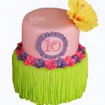Этот торт — настоящий праздник тропиков! Два яруса в сочных оттенках розового, желтого и зеленого создают атмосферу беззаботного лета. Верхний ярус украшен объемными цветами с лепестками, напоминающими гибискус, а нижний — стилизованными пальмовыми листьями. Яркие краски и плавные линии декора переносят на солнечные пляжи, где царит веселье. Каждый элемент торта словно танцует под ритмы гавайской музыки, добавляя торжеству особого настроения.