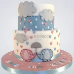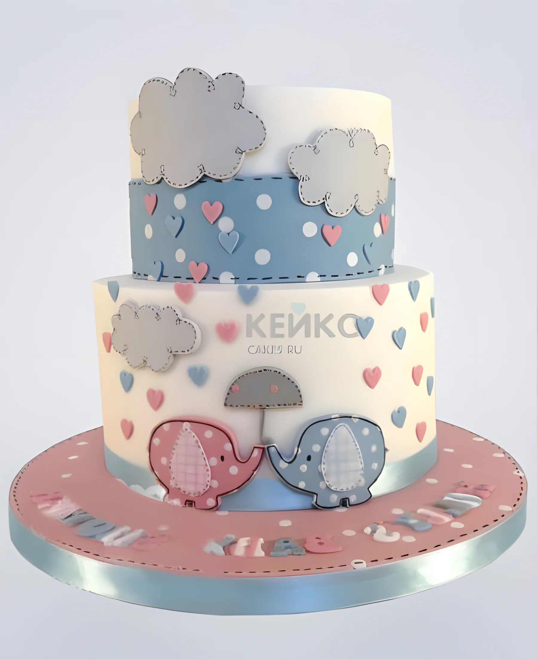 Этот двухъярусный круглый торт украшен нежными фигурками слонов и воздушными облаками из мастики. Дизайн выполнен в пастельных тонах, создавая атмосферу легкости и сказочности. Верхний ярус украшен миниатюрными слониками, а нижний — пушистыми облаками, что делает торт идеальным для детского праздника. Мастика придает торту гладкую и аккуратную поверхность, а общая композиция выглядит очень гармонично.