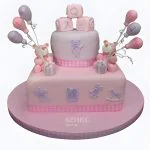Торт розовый с двумя мишками и воздушными шарами